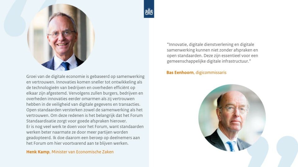 “Innovatie, digitale dienstverlening en digitale samenwerking kunnen niet zonder afspraken en open standaarden. Deze zijn essentieel voor een gemeenschappelijke digitale infrastructuur.“