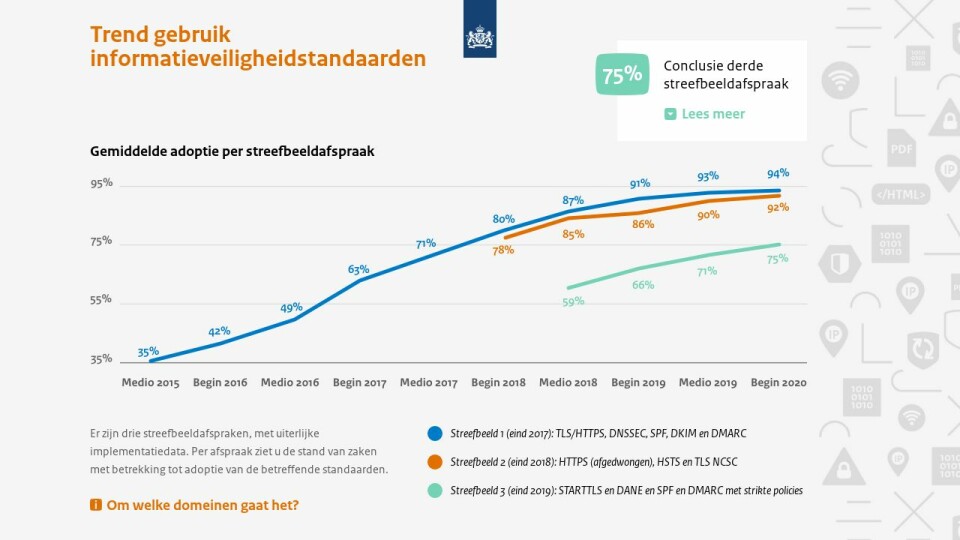 Eind 2019 is de uiterste realisatiedatum van de derde overheidsbrede streefbeeldafspraak verlopen. Deze streefbeeldafspraak gaat over zowel het implementeren van STARTTLS en DANE (om vertrouwelijkheid van e-mailverkeer te borgen) als het voldoende strikt configureren van SPF en DMARC (om e-mailspoofing tegen te gaan). In het afgelopen half jaar is de groei in adoptiegraad verder afgevlakt en laat deze eindmeting van de streefbeeldafspraak een adoptiegraad van 75% zien.