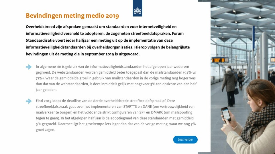 Overheidsbreed zijn afspraken gemaakt om standaarden voor internetveiligheid en informatieveiligheid versneld te adopteren, de zogeheten streefbeeldafspraken. Forum Standaardisatie voert ieder halfjaar een meting uit op de implementatie van deze informatieveiligheidstandaarden bij overheidsorganisaties. Hierop volgen de belangrijkste bevindingen uit de meting die in september 2019 is uitgevoerd.
